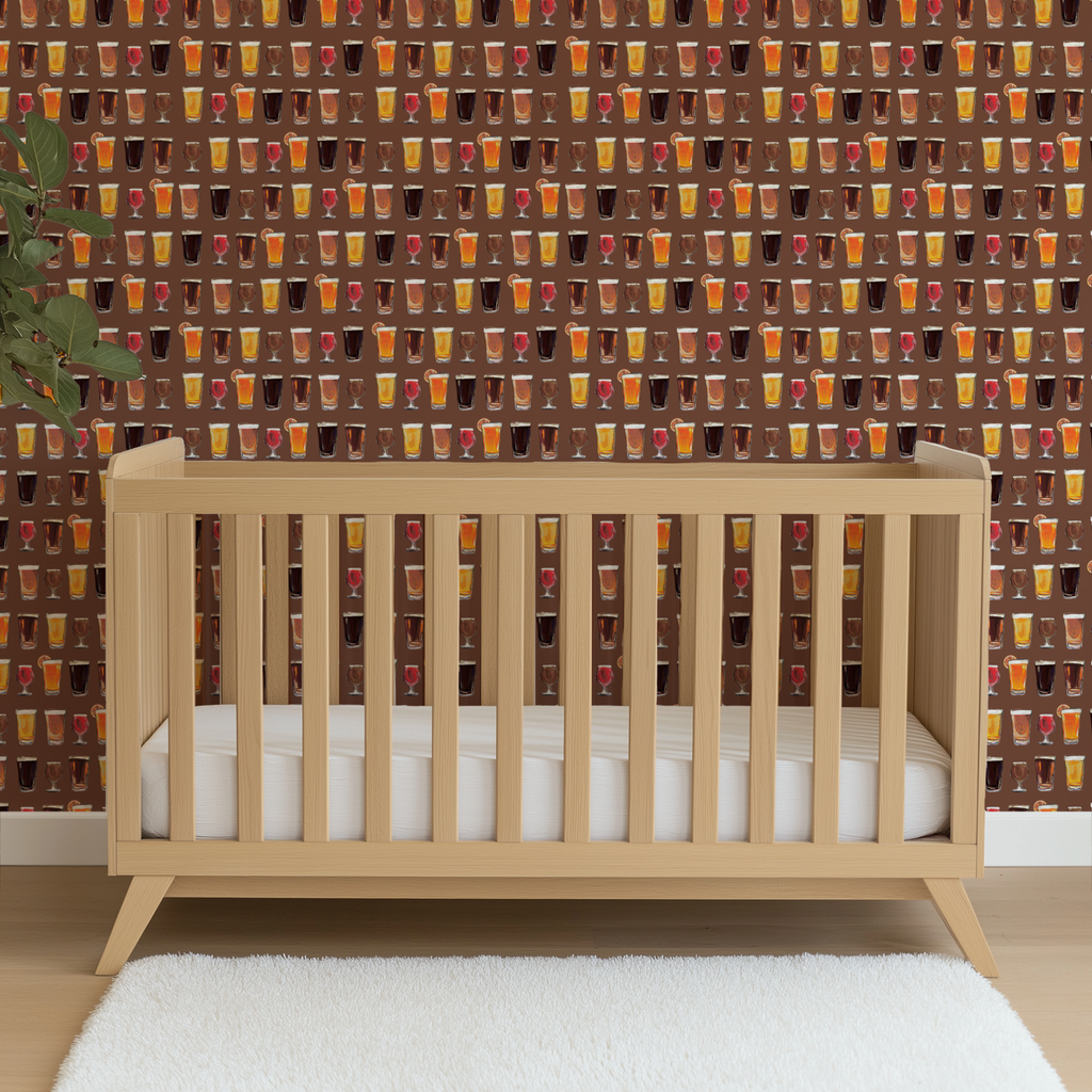 A pattern of various beer glasses featuring light lagers, dark stouts, and red ales arranged in rows on a brown background. Perfect for beer lovers, bar decor, and craft brewery enthusiasts.