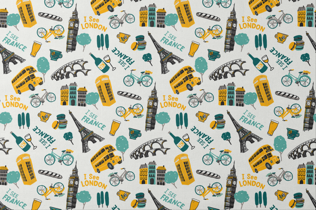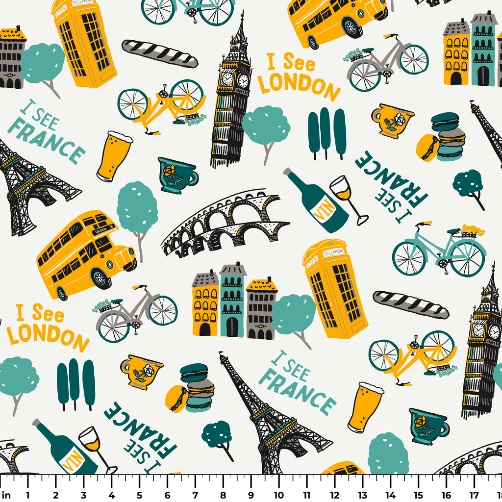 Explore iconic European cities with this whimsical travel pattern featuring London telephone booths, double-decker buses, the Eiffel Tower, and charming bicycles in a cheerful yellow and teal color palette.