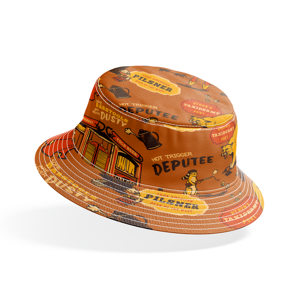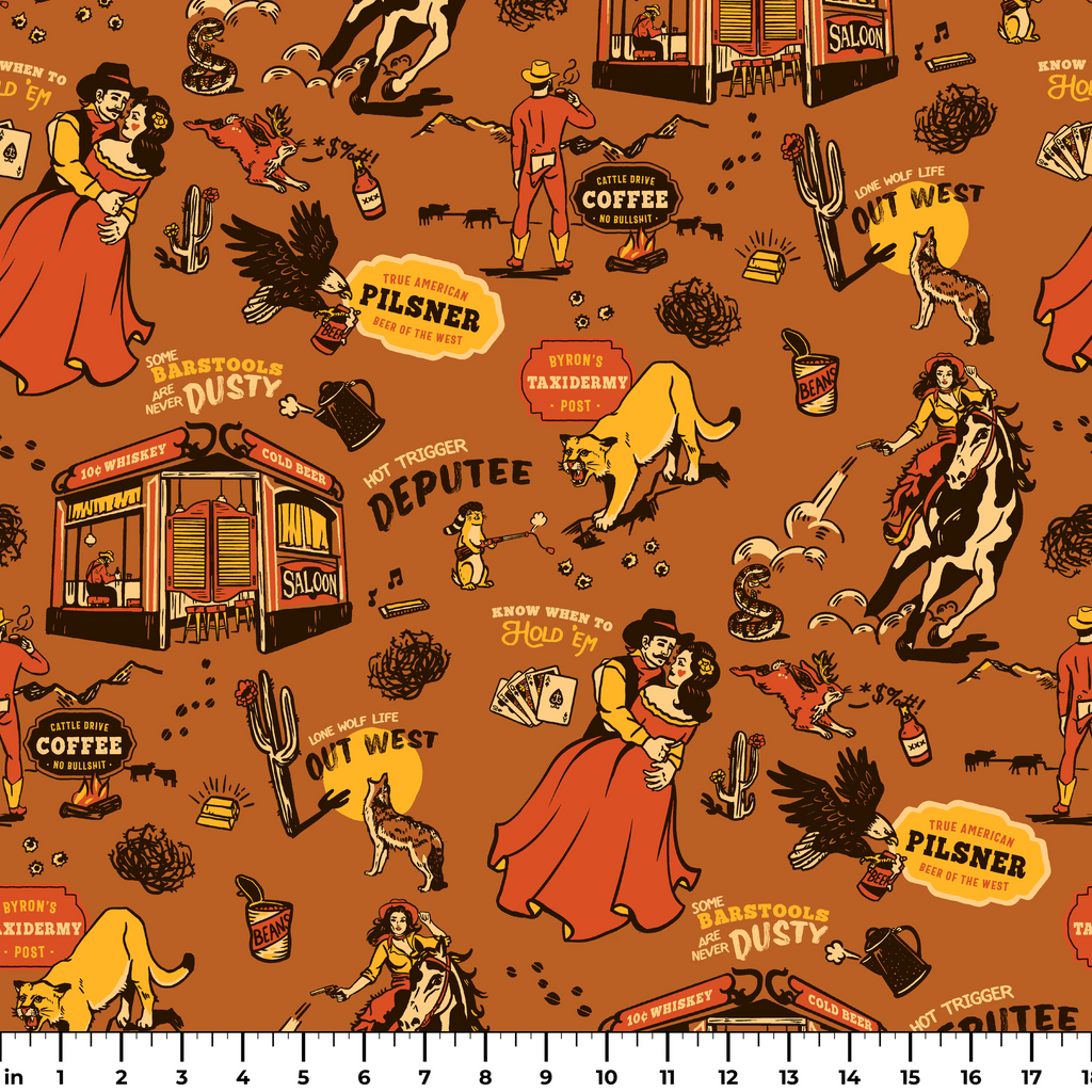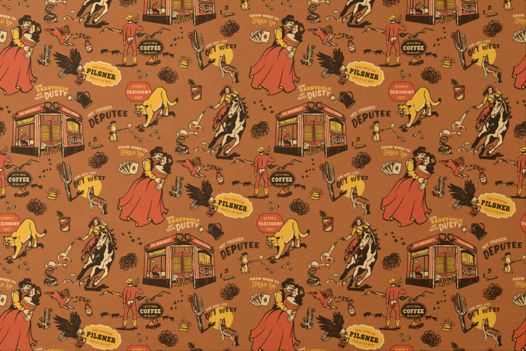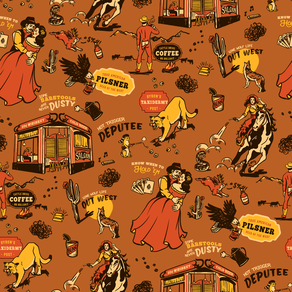 Vintage-inspired western cowboy pattern with rodeo scenes, saloons, and beer motifs in rich, earthy brown tones. Perfect for rustic, nostalgic home decor.