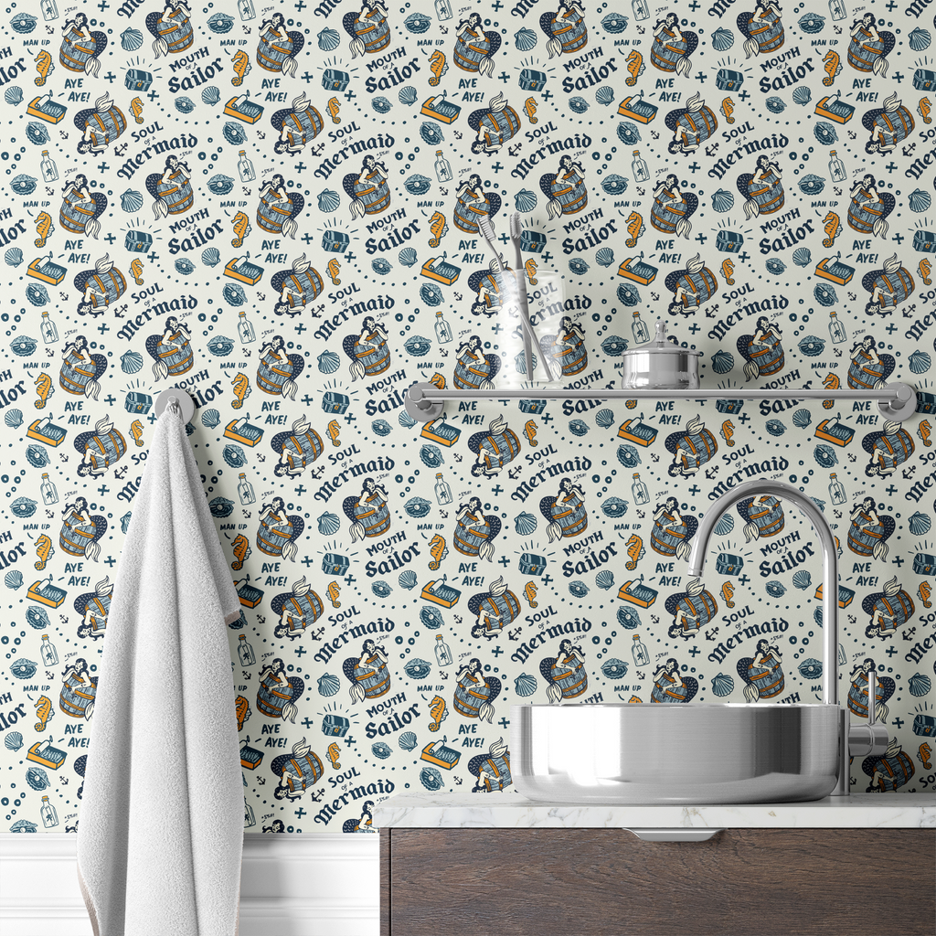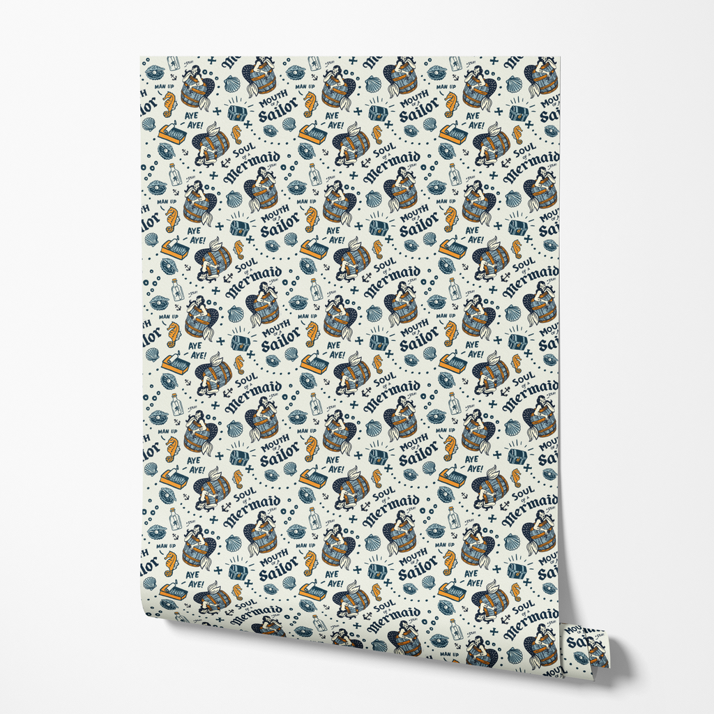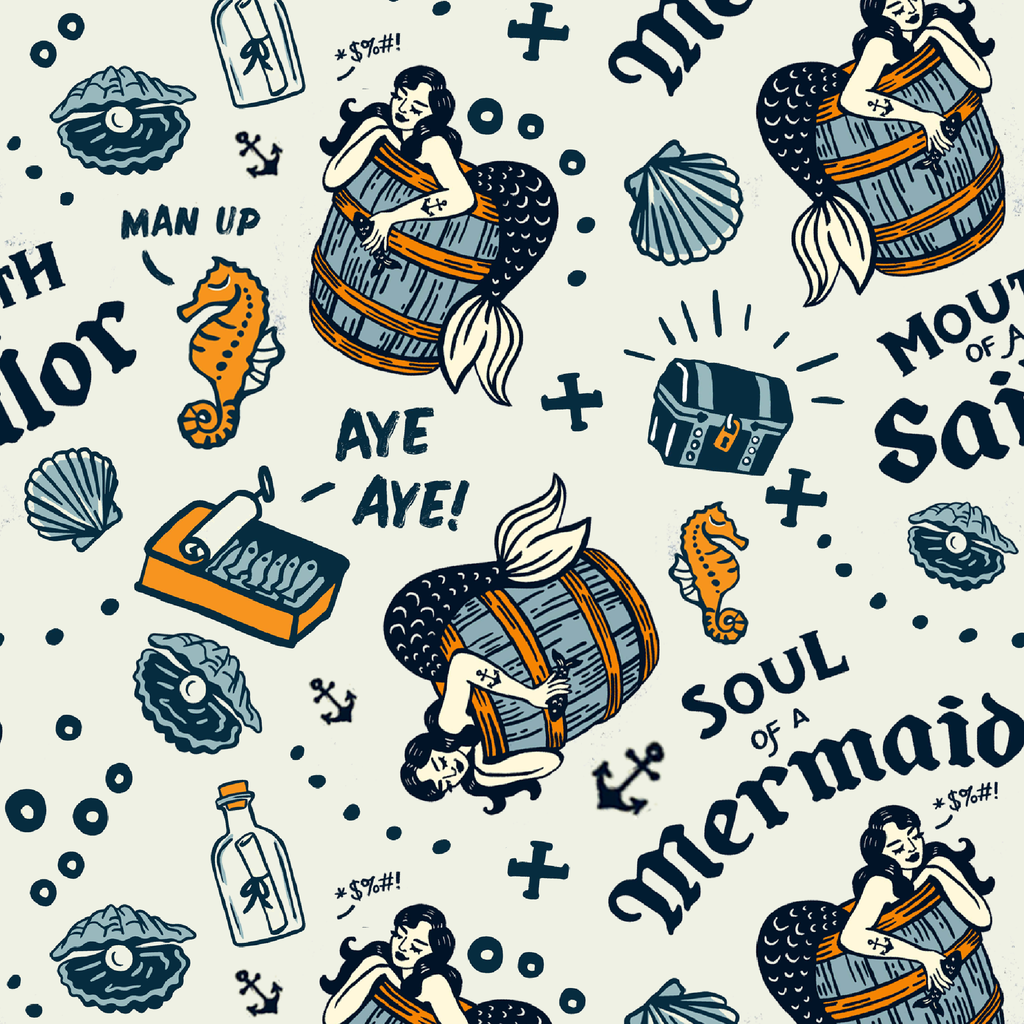 Nautical tattoo-style artwork featuring mermaids in barrels, seahorses, shells and sailor phrases like "Aye Aye!" A vintage-inspired maritime design with navy blue and orange illustrations.