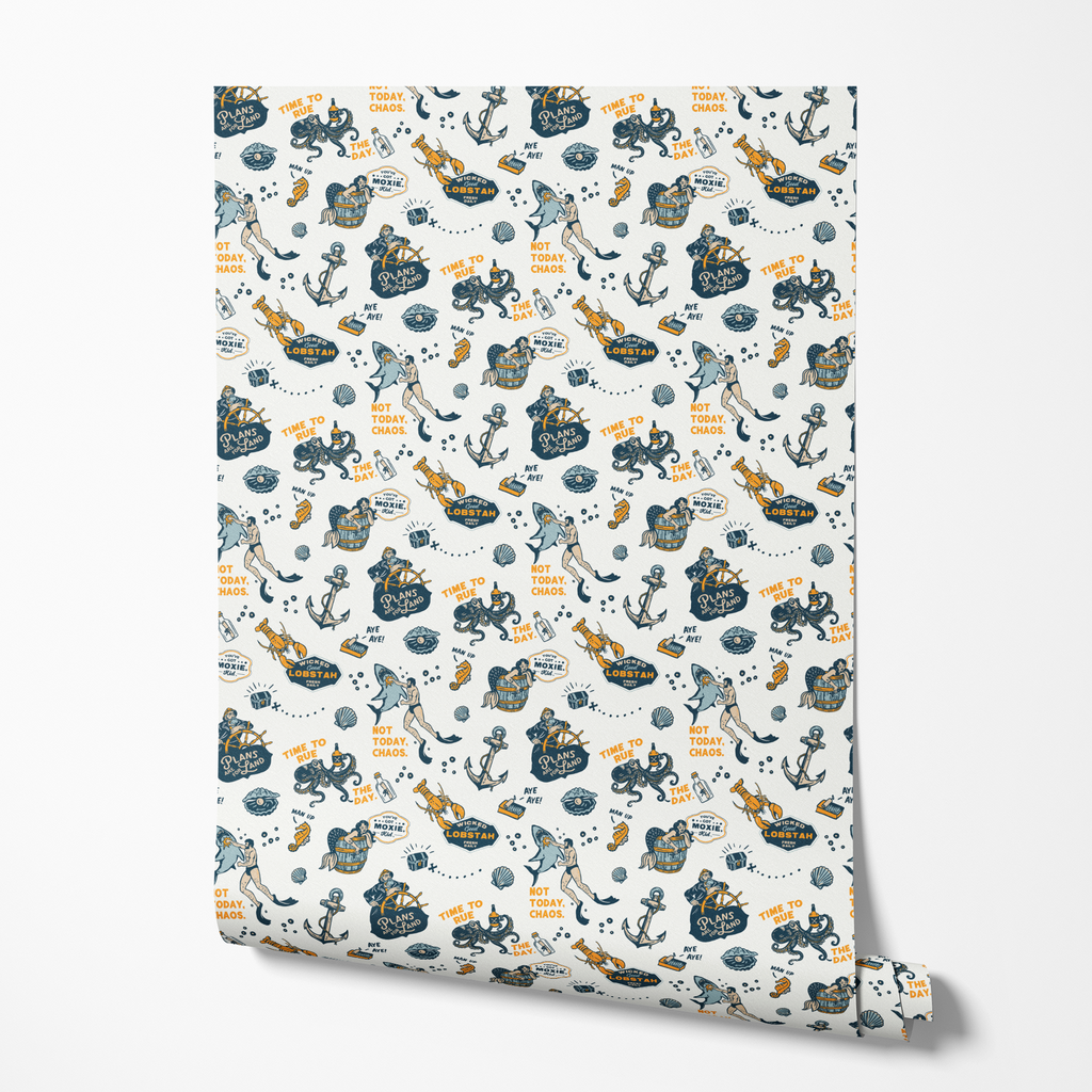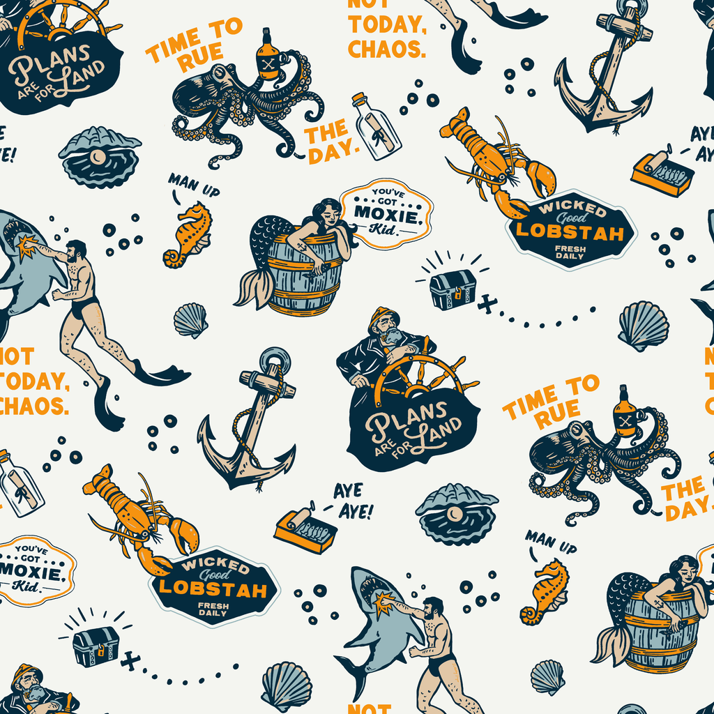 Nautical vintage pattern with navy blue octopus, seahorses, and anchors on a light background featuring "Dive Back Into Chaos" slogans and maritime elements.