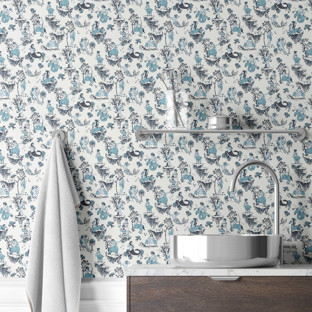 This delightful toile pattern features mythical mermaids and fantasy scenes in soft blue and navy tones on a cream background, perfect for a whimsical coastal-inspired home decor.