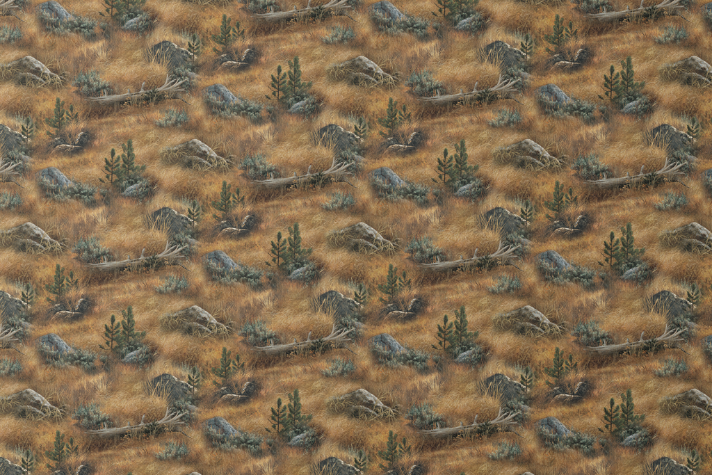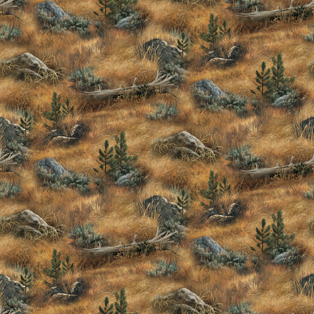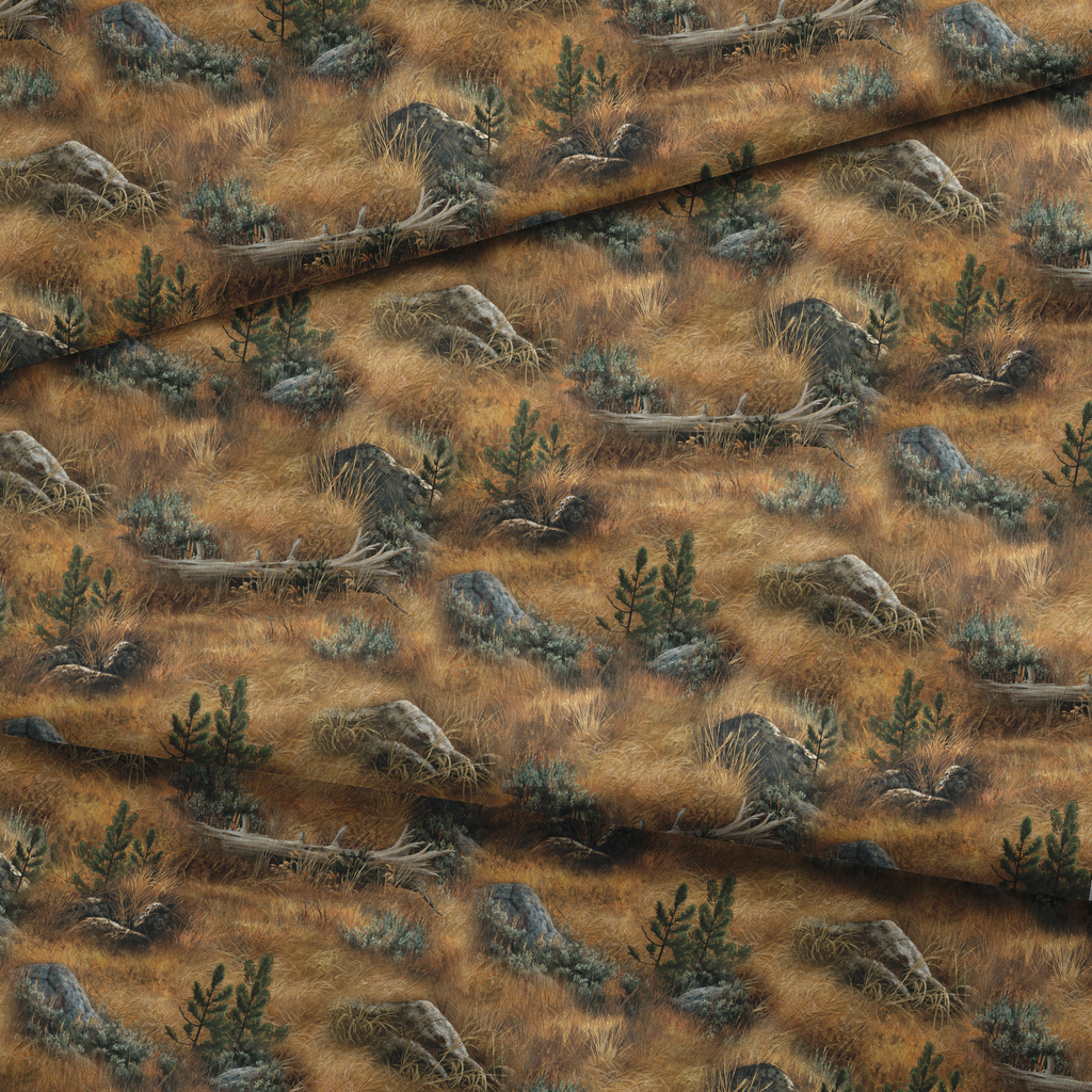 Rustic western Wild Wings landscape featuring golden prairie grass, scattered rocks, and desert vegetation in warm earth tones. Perfect for outdoor-inspired home decor and apparel.