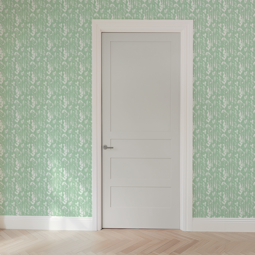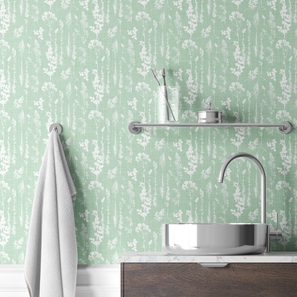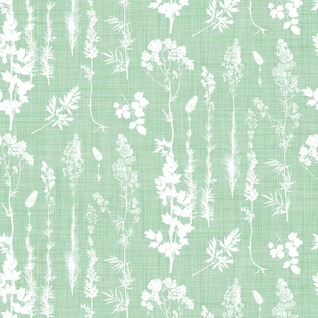Delicate botanical silhouettes on a sage green textured background create a fresh, contemporary pattern perfect for adding a light spring aesthetic to any space.