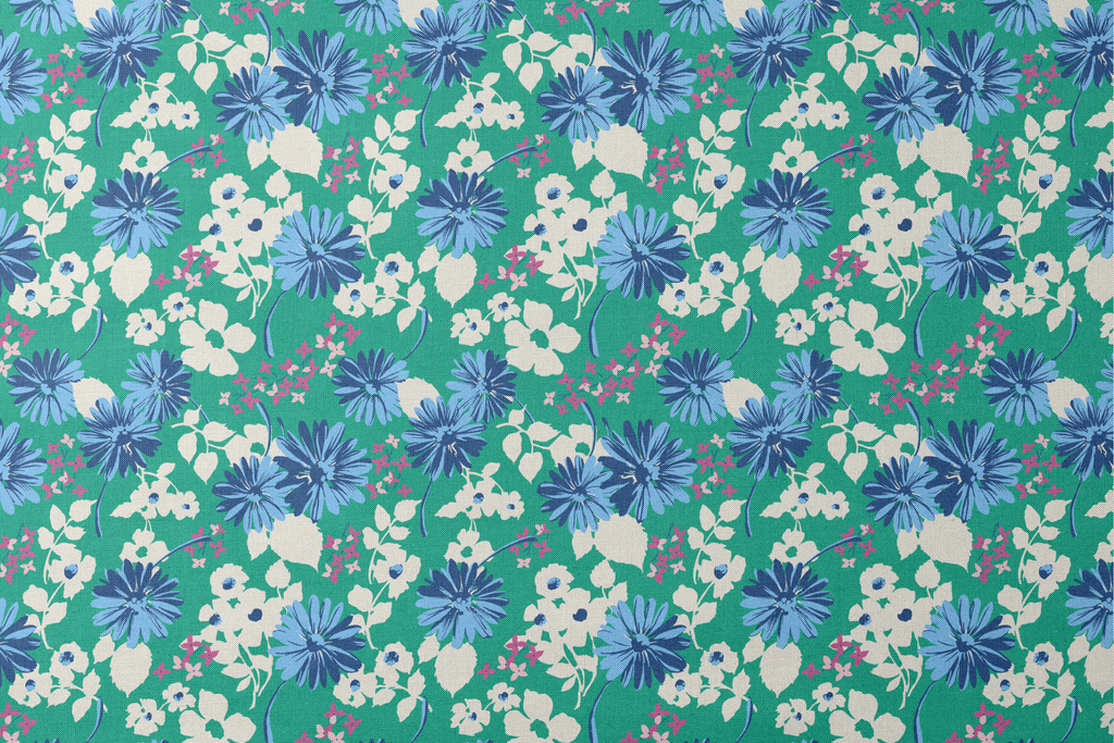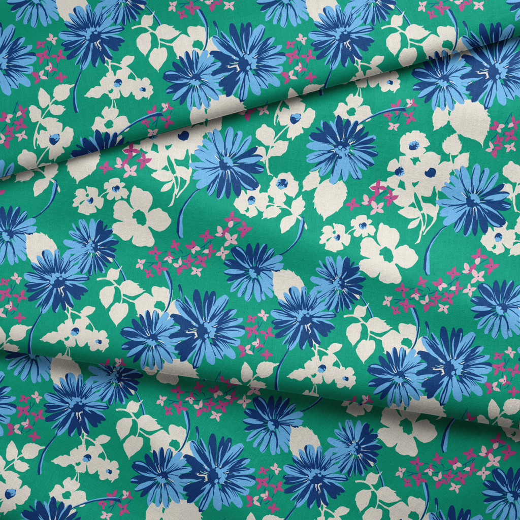 Vibrant blue cornflowers and delicate white blossoms dance across a rich teal background in this fresh floral pattern, perfect for spring apparel or contemporary home decor.