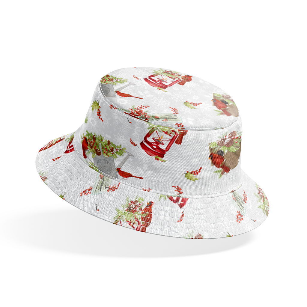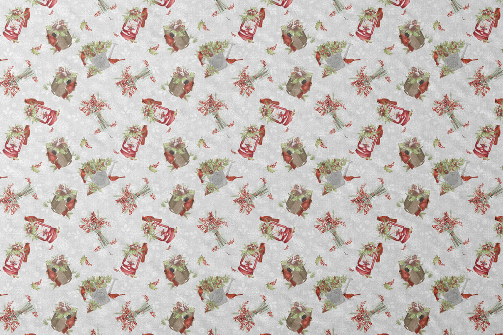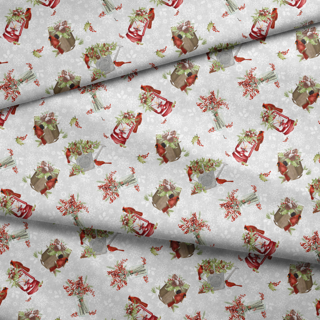 Rustic winter fabric design featuring red cardinals, holly berries, and cozy arrangements on a snowy background.