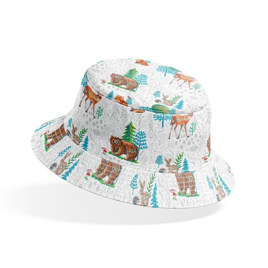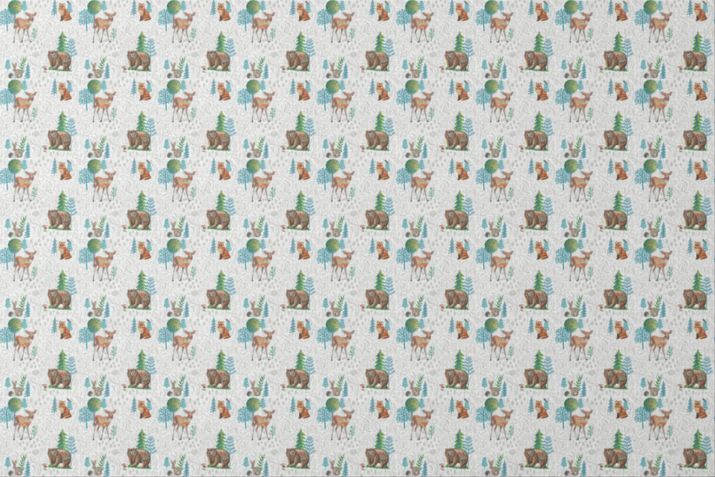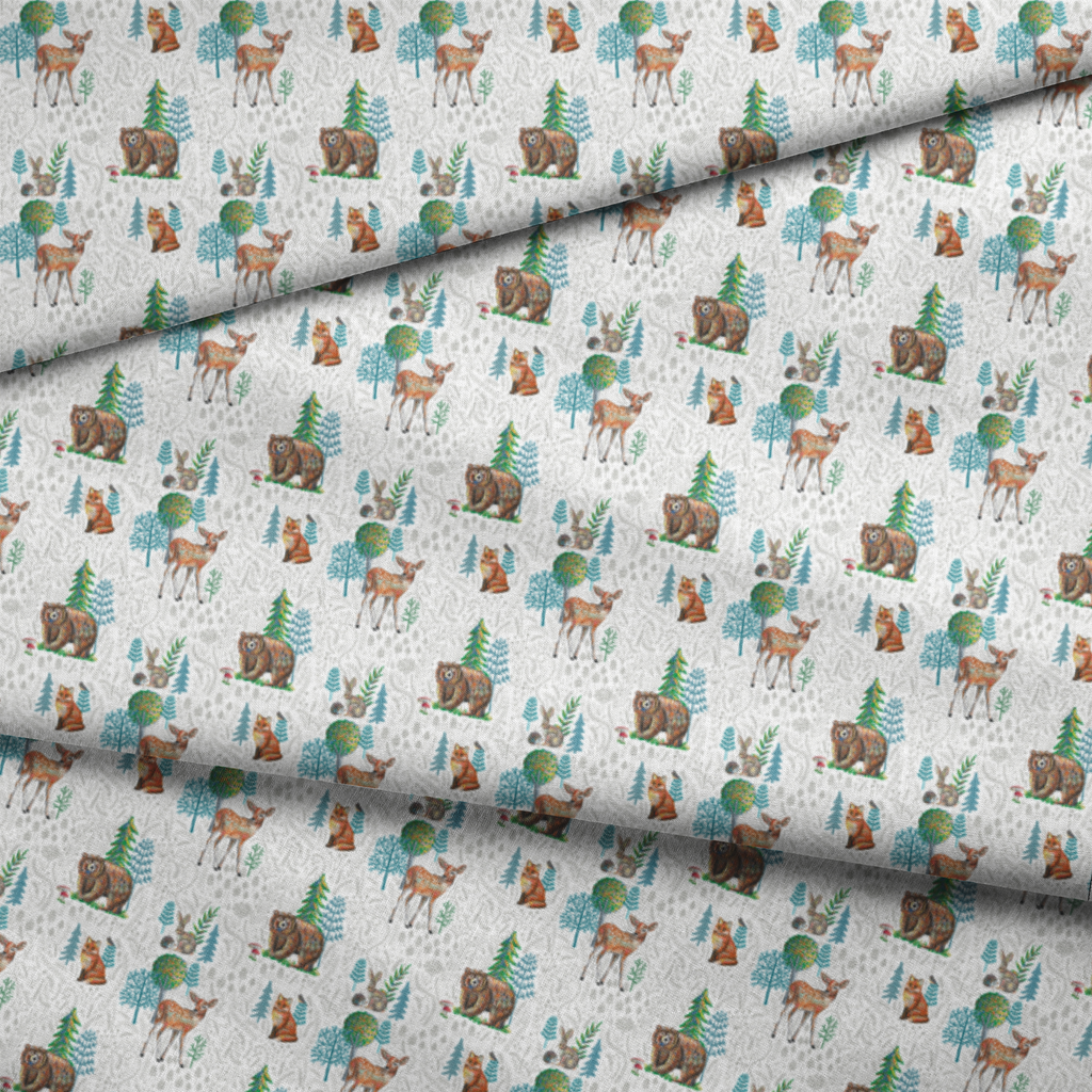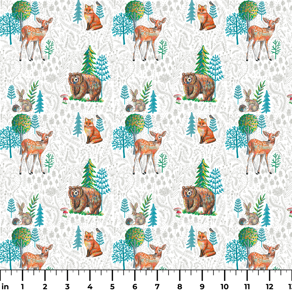 Woodland animals grace a whimsical forest scene in teal and orange. A fawn, fox, bear, and rabbit surrounded by stylized pine trees create a charming wildlife motif perfect for nature lovers.