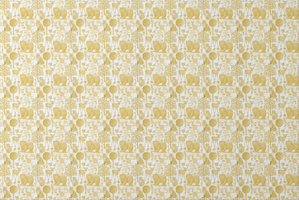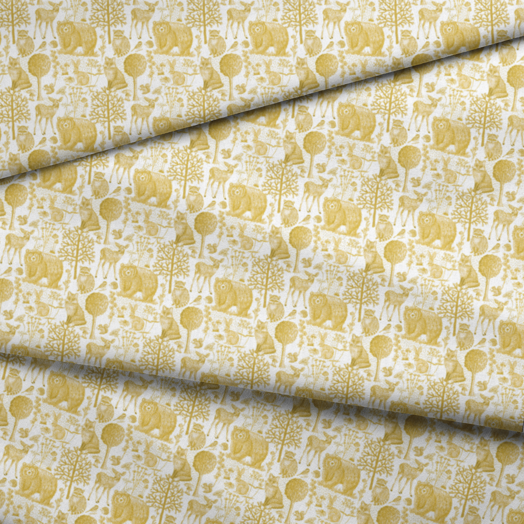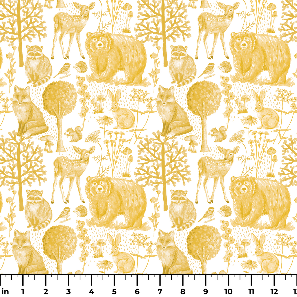 Woodland creatures in golden yellow illustration featuring a deer, bear, fox, raccoon, bird and squirrel among stylized trees and forest elements in a charming folk art pattern.
