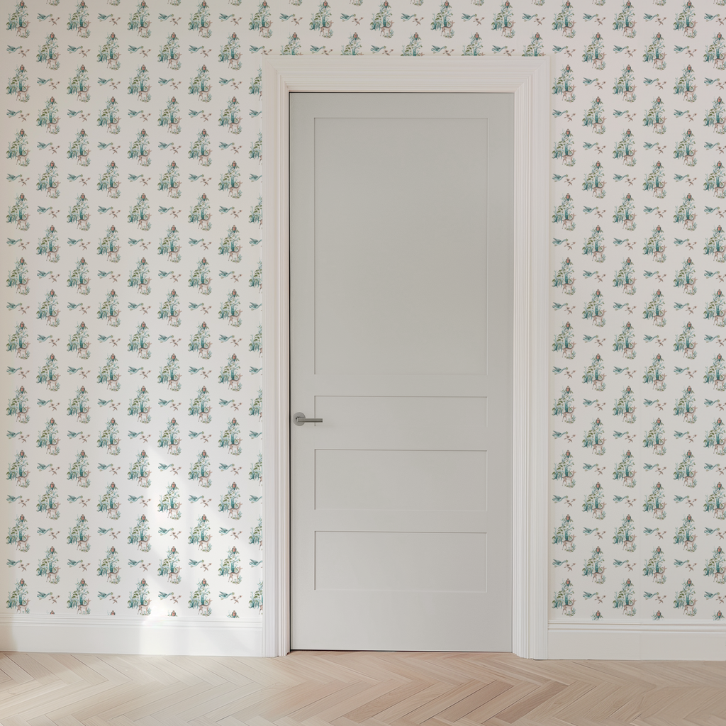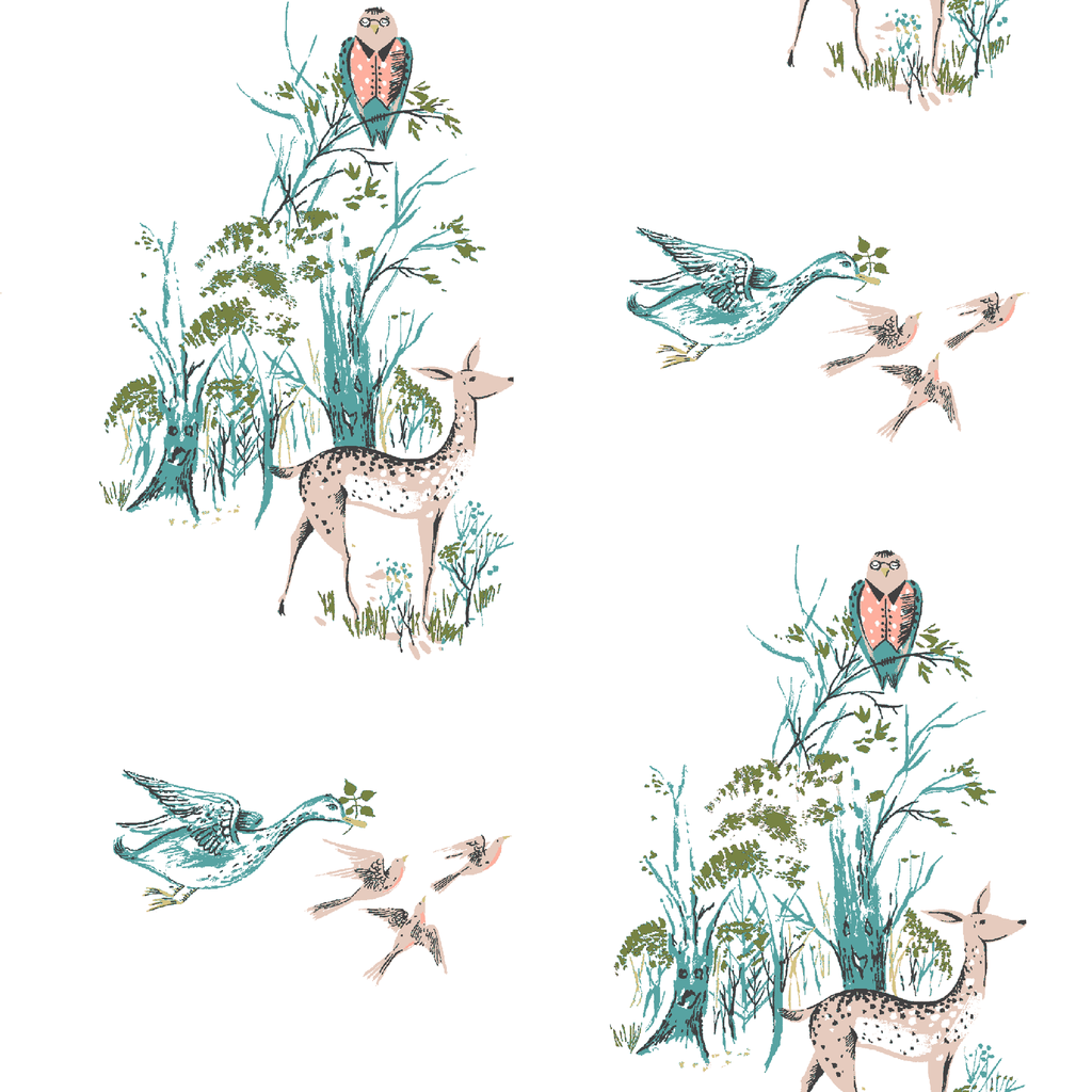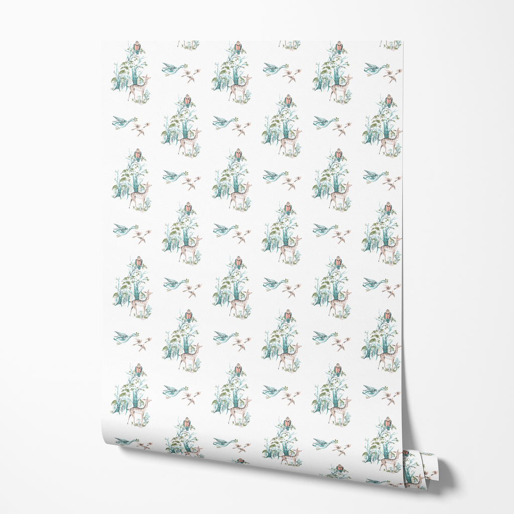 Enchanting woodland wallpaper with gentle deer, perched owls, and birds in flight. This delicate nature-inspired design brings a whimsical forest scene to life in soft watercolor style.