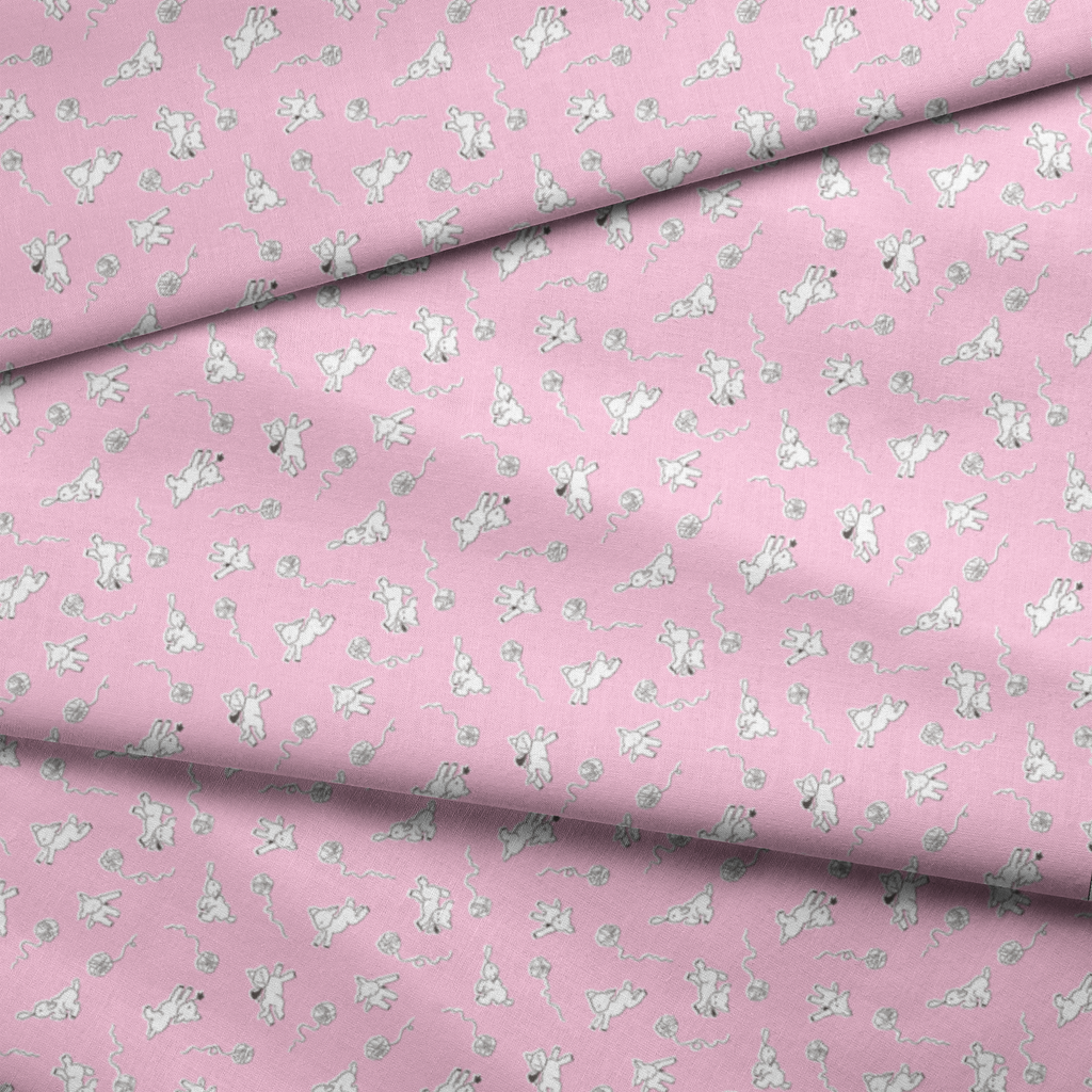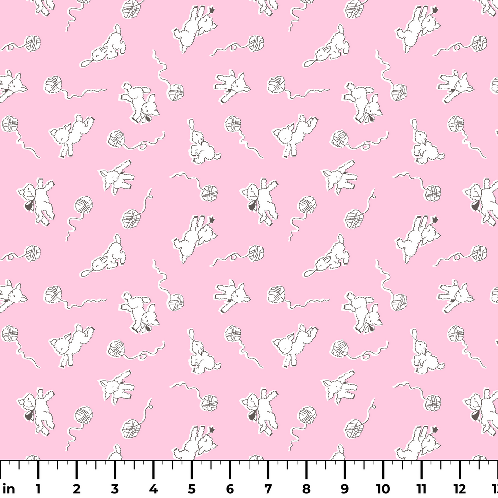 Playful lambs and balls of yarn dance across a sweet candy pink background in this charming design. The simple black and white line drawings of fluffy sheep paired with yarn balls connected by delicate threads create a whimsical pattern perfect for nursery projects. This design would make adorable baby blankets or soft pillowcases.