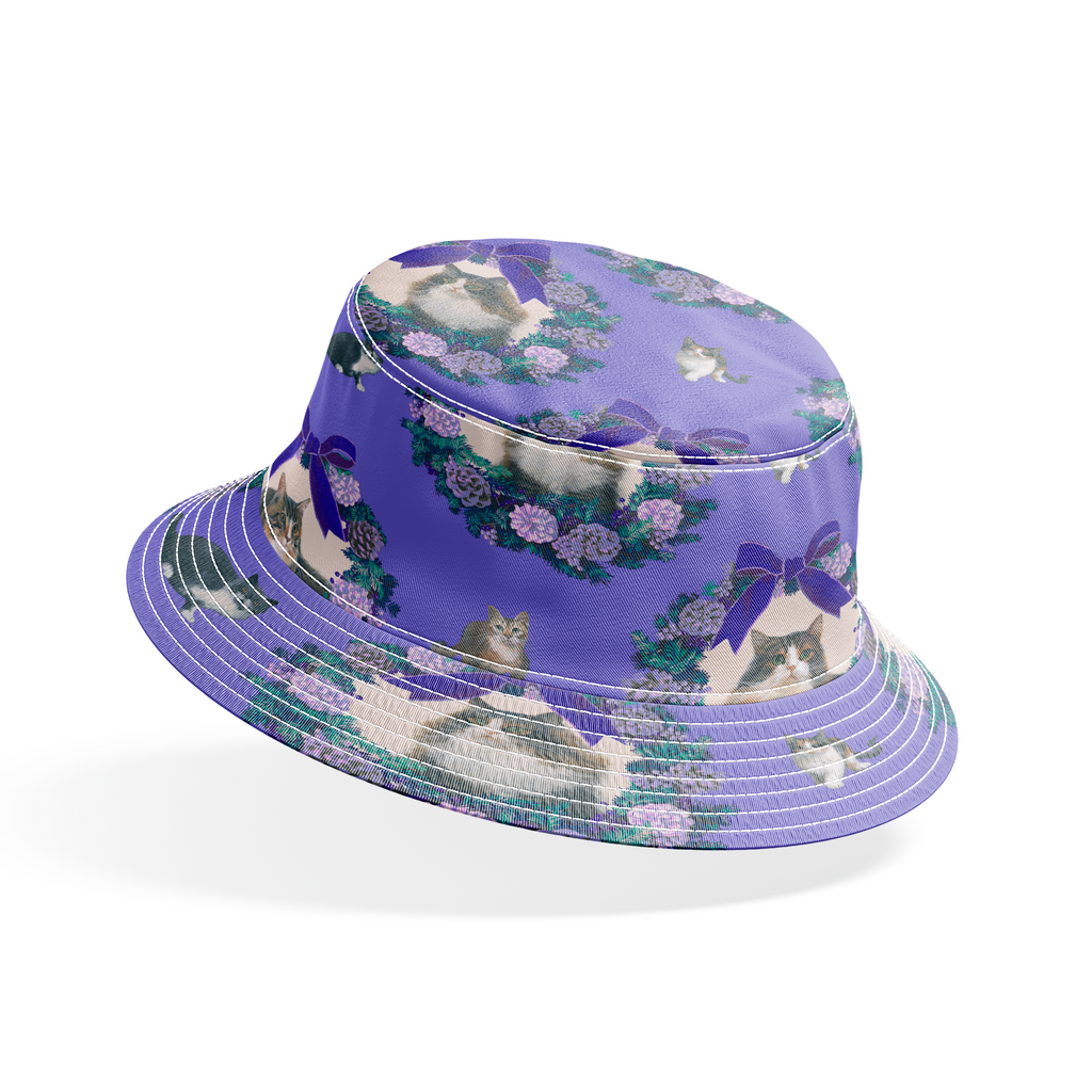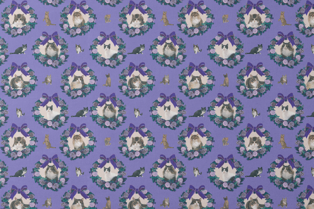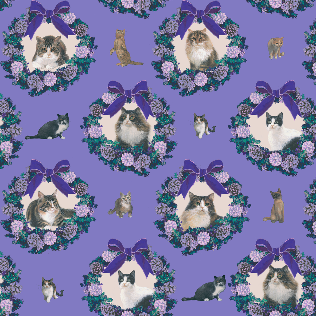 Adorable cats and kittens in purple floral wreaths with ribbons on a lavender background, perfect for cat lovers and whimsical home decor projects.