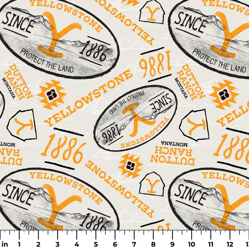 Designed from the show, Yellowstone ranch badge and patch fabric design in earthy black, gold, and rust tones on a textured cream background. Features “Protect the Land” and Dutton Ranch icons in a scattered layout perfect for western-themed sewing projects or rustic quilting projects.